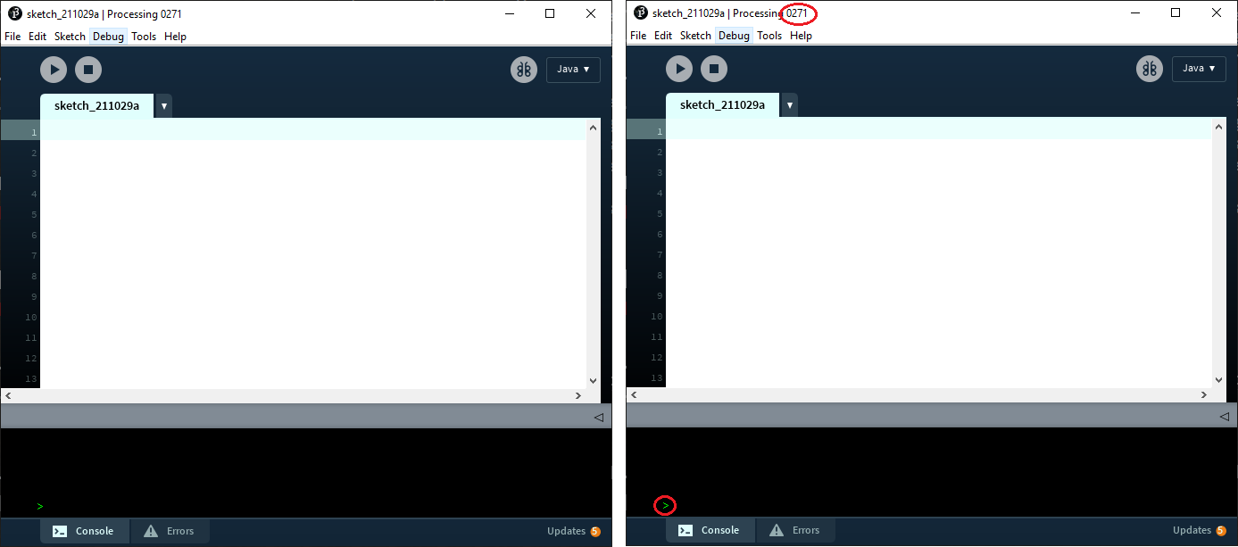 If you have any other versions of processing on your computer, make sure they are closed. The IDE that pops up should have 0271 in the top corner and a small green > down in the bottom left corner. If either of these are missing you are using the wrong version.